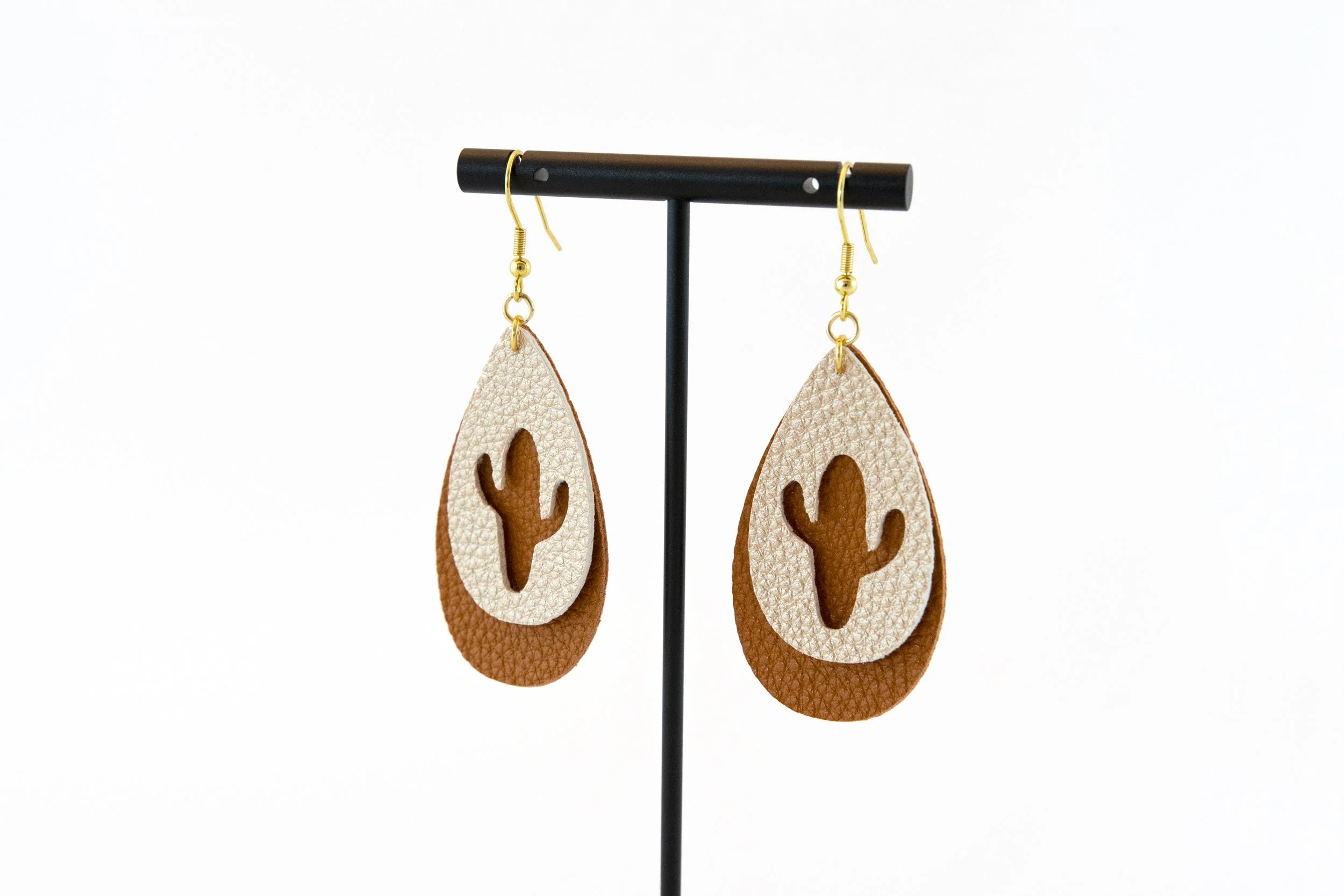 I designed and assembled these cactus-themed earrings. They are made from layered faux leather pieces, which I cut with a Cricut Maker. There are two color options for the faux leather: green/gold and brown/gold.