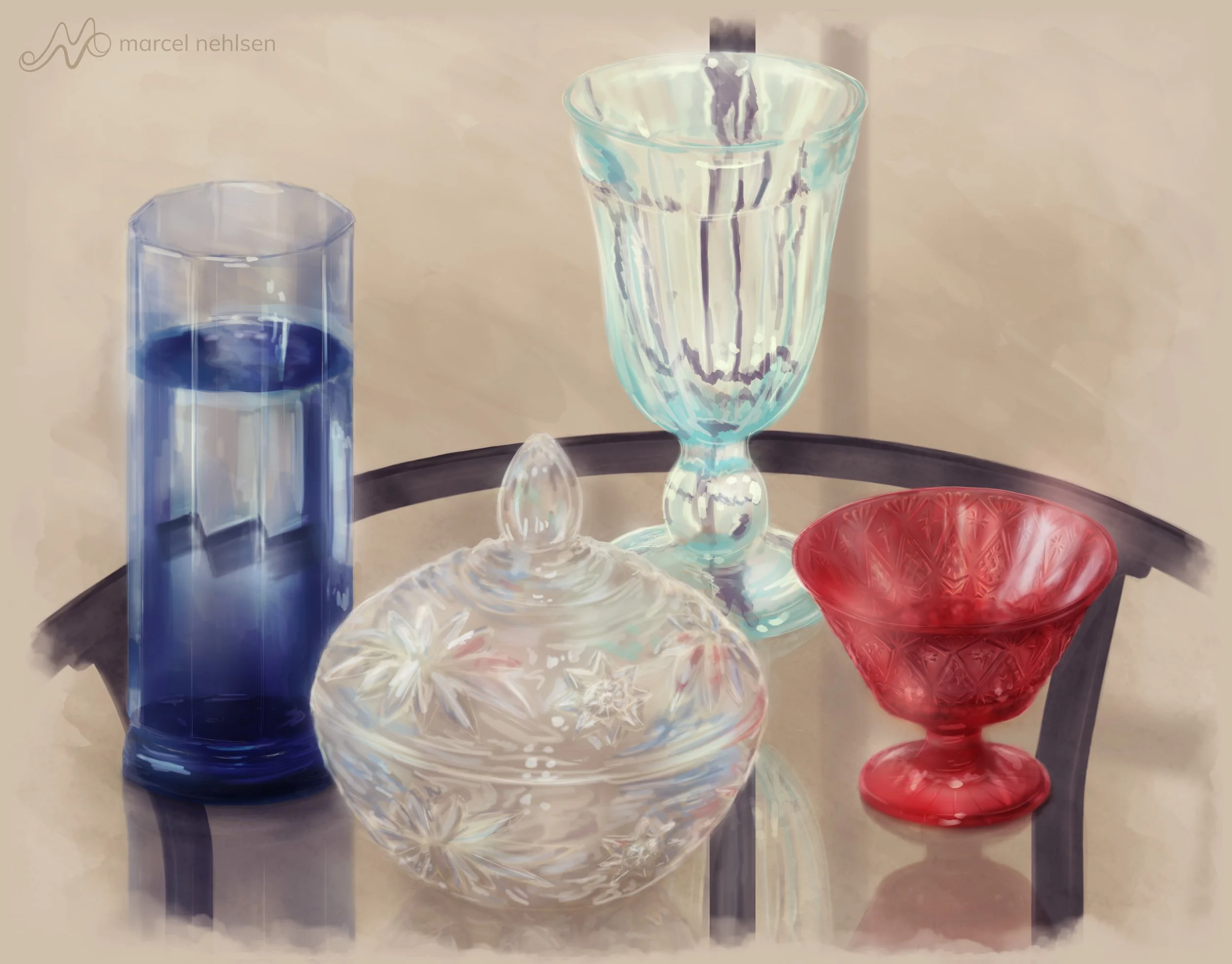 I enjoy collecting glass cups and containers, which I arranged on a table to create this still life. It features a variety of shapes, colors, and textures for contrast. I also used loose brush strokes and sketchy lines for a more painterly, energetic style.