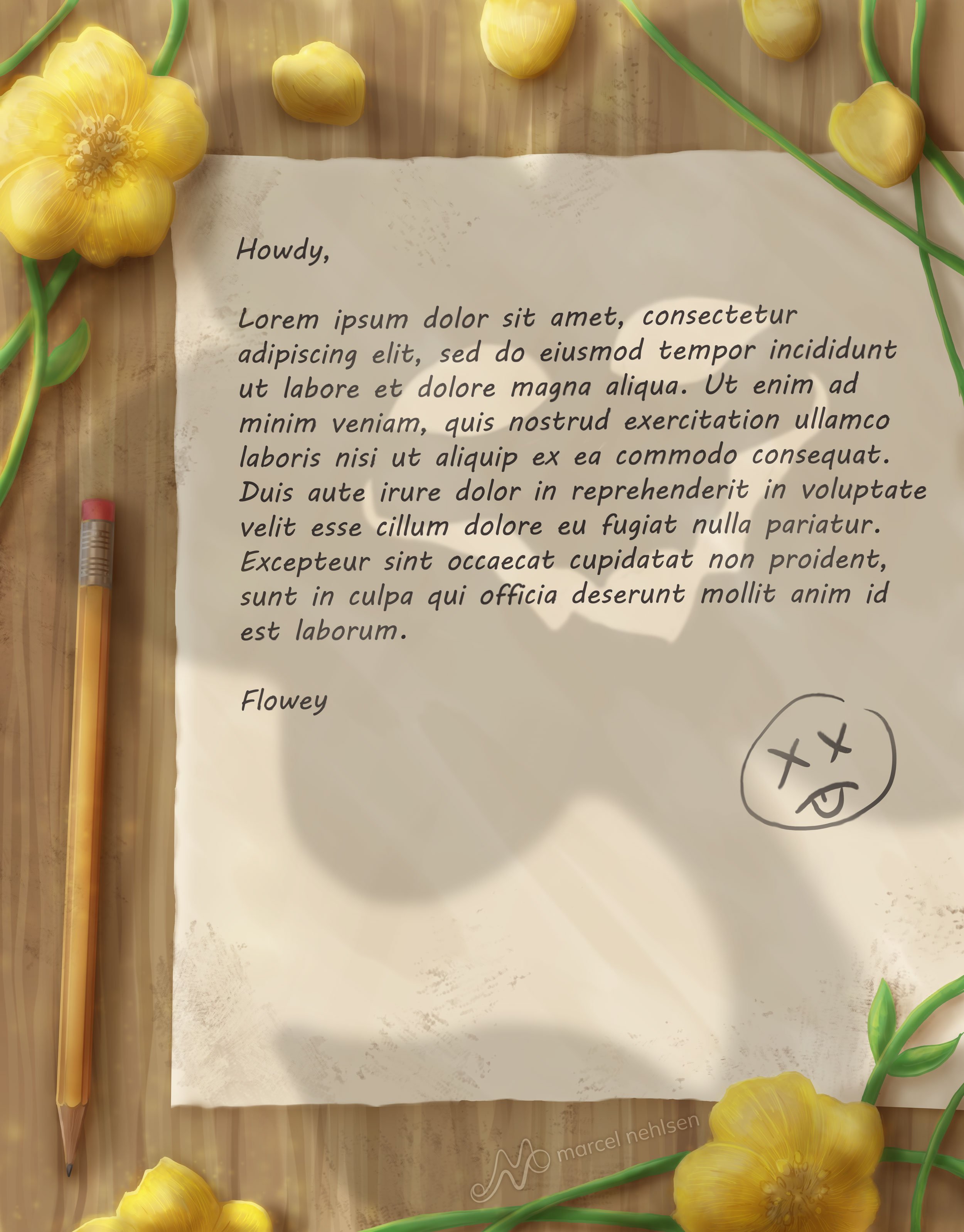 Promo illustration shared on InLove’s Tumblr account. This character “speaks” with the Papyrus font in-game, so it was a deliberate choice! I drew the artwork, while @1doubleoh wrote the letter's contents.